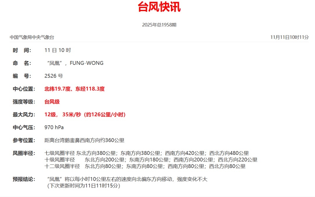 今年第26号台风“凤凰”已进入我国24小时警戒线,11日夜间开始逐渐转向东北方向移动,强度逐渐减弱,并将于12日下午到晚上,在台湾岛西南部沿海再次登陆。